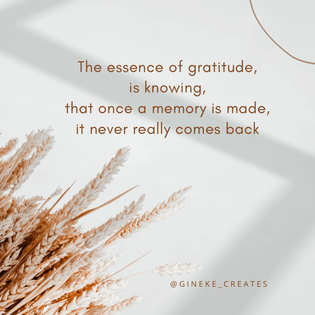 You are only young once! something you only realize, when you are old enough to understand, there is no going back. Tears mix with laughter, as memories flood my mind, presenting themselves like photographs, yellow and almost falling apart. Time has gone by so fast, and only now, I wish, I could turn it back. People have come and gone. I would give the world, to see them one more time! On my grandfather’s knee, or next to my dad eating nectarines, while having a picknick on the grass. I would give everything to see, my mom laugh one more time! The essence of gratitude, is knowing that once a memory is made, it never really comes back.