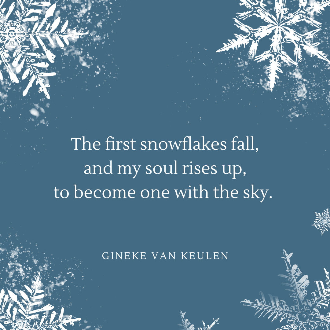 The first snowflakes fall, and my soul rises up, to become one with the sky. My arms spread wide, like the wings of angels. My joy overflows, as I put my trust in you. I rise and I fall, as I am dancing on the wind, and my heart surrenders, to the beating of your love. I wish, I understood, how the wind blows, in and out of this world. I wish, I could hold on, to each snowflake, and hold it in my hands. But only in complete surrender, can my wings find the strength, to take off and fly away. Away to a place, beyond this ice cold universe, where your arms are waiting, to welcome me home, in paradise.